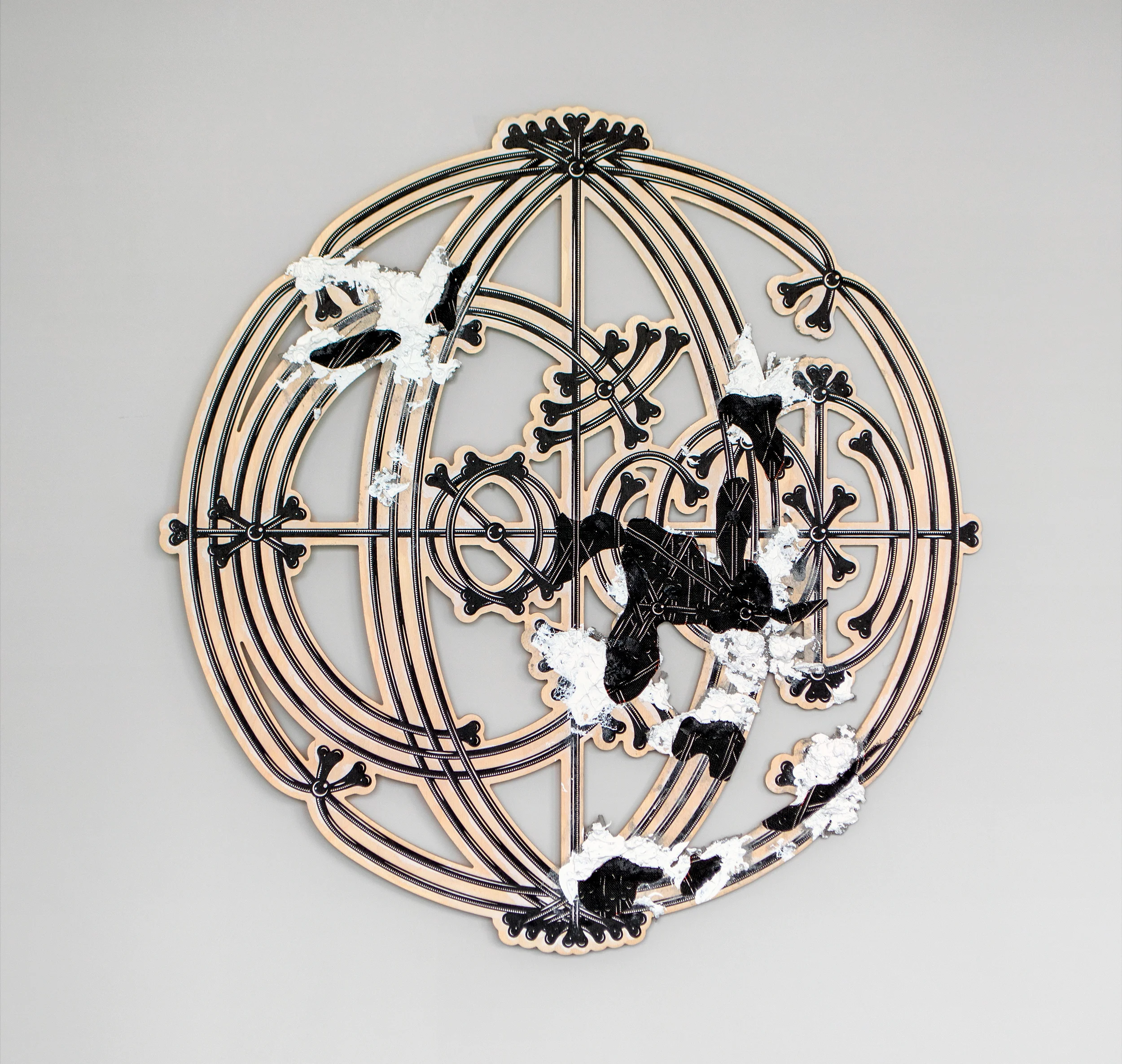 Acrylic prime, enamel, strips of printed canvas and concrete on cut plywood